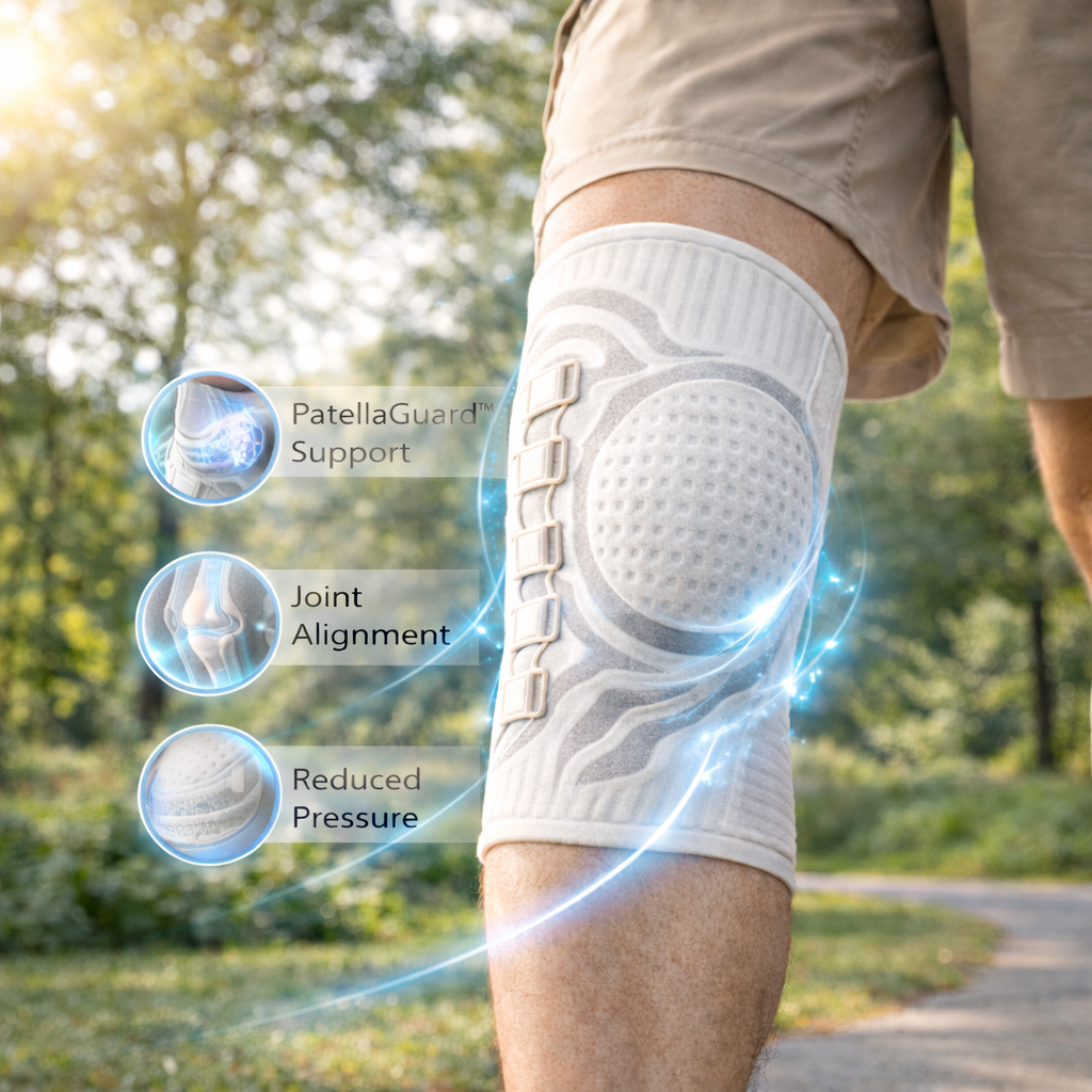 The PatellaGuard™ surrounds the knee with targeted structural protection that keeps the joint aligned and reduces internal pressure in just minutes. This focused stability prevents micro movimentos que causam dor e traz uma sensação imediata de firmeza e controle. You move with confidence and feel your knee respond with natural strength and comfort.
